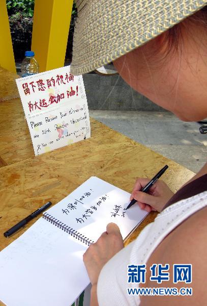 7月11日,市民在深圳大劇院U站為大運(yùn)會寫下祝福。從7月1日起至大運(yùn)會期間,被稱為“U站”的818個(gè)深圳大運(yùn)會志愿者服務(wù)站將在深圳全面鋪開,為市民游客提供指路服務(wù)、門票場館信息和宣傳大運(yùn)會等便民服務(wù)。新華社記者劉大偉攝
