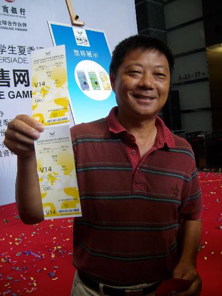 7月11日,第一個購買到深圳大運會賽事門票的深圳市民林先生高興地展示門票。當日,深圳第26屆世界大學生夏季運動會開始面向公眾發(fā)售至少180萬張門票,占深圳大運會總票量的65%。大運會門票票價從30元到300元不等,此外還專設10元的學生票。新華社記者詹奕嘉攝