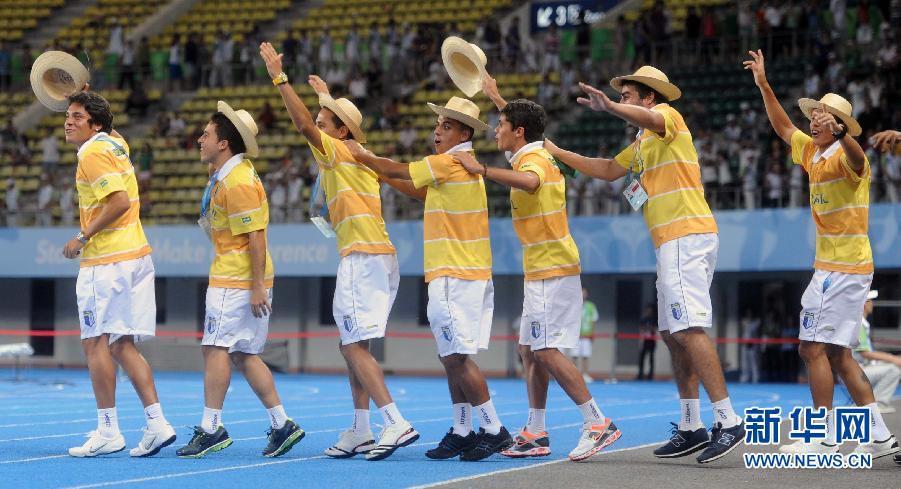 8月22日,巴西隊隊員戴著帽子跳著舞蹈走向領獎臺。當日,在第二十六屆大運會男足決賽中,日本隊2比0戰(zhàn)勝英國隊奪得冠軍,英國隊獲得亞軍,巴西隊獲得季軍。在頒獎儀式上,獲得季軍的巴西隊隊員戴著草帽跳著舞蹈走上領獎臺,并把帽子分發(fā)日本隊隊員和英國隊隊員。新華社記者李尕攝