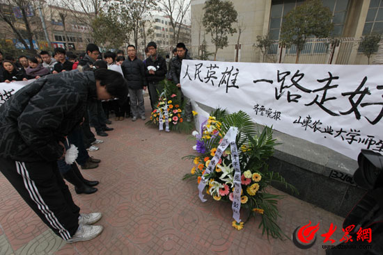大眾網(wǎng)泰安1月5日訊(記者 曹亮 盛堃)“灑一腔熱血 鑄泰山英魂”,白底黑色大字莊嚴(yán)肅穆,白黃菊花整齊的擺放在泰安民警堵截歹徒的事發(fā)地點(diǎn)。自從今天上午9時(shí)起,泰安市民自發(fā)組織起來(lái),悼念在“1.04”襲警案件中因公犧牲的兩名民警、一名協(xié)勤。 稍后大眾網(wǎng)記者將為您帶來(lái)報(bào)道,今天下午,警方將通報(bào)犯罪嫌疑人情況。