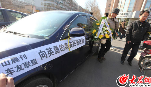 肅立,默哀,鳴笛,今日13時(shí),泰山車友聯(lián)盟自發(fā)組織近300輛汽車輕飄著黃絲帶,在泰安“1.04”案件圍捕現(xiàn)場集結(jié),長達(dá)一分鐘的致哀鳴笛響徹全城。