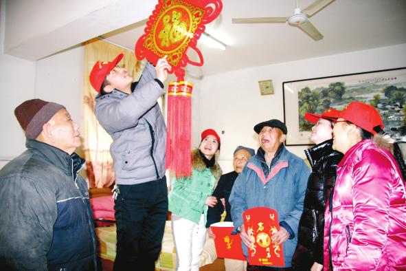 1月12日,淮北供電公司燕飛志愿者服務(wù)隊成員為市社會福利中心掛“中國結(jié)”。
