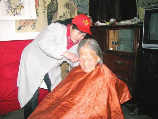 志愿者章雪為汪范氏義務(wù)剪頭發(fā)。