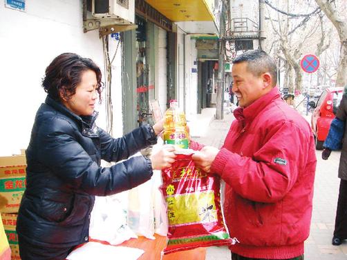 15日上午10時許,淮北市洪山社區(qū)的特困戶們來到了劉西峰的超市門口,幫忙搬運(yùn)即將發(fā)放的慰問品。一桶油、一袋面、一袋米是劉西峰為困難戶準(zhǔn)備的新年禮物。