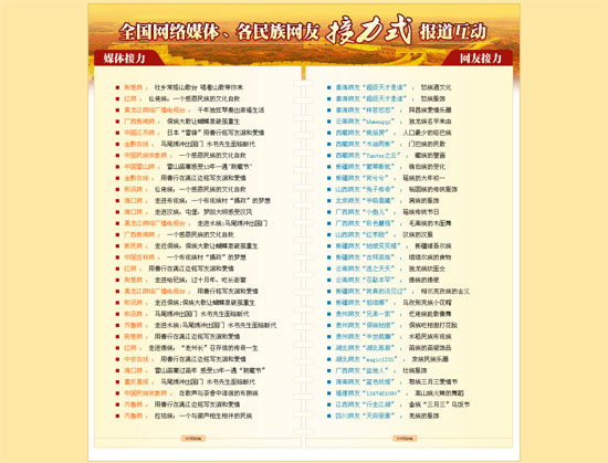 后方編輯還根據(jù)采訪團(tuán)隊(duì)行程提前聯(lián)系了全國90余家重點(diǎn)新聞網(wǎng)站和國內(nèi)知名媒體共同參與報(bào)道,為了更好的呈現(xiàn)90家網(wǎng)站和媒體的接力報(bào)道,專題開設(shè)“接力式互動(dòng)報(bào)道”版塊。前方采訪團(tuán)每到一個(gè)地方,當(dāng)?shù)鼐W(wǎng)站媒體記者積極參與報(bào)道并拿出重要位置進(jìn)行推薦,在當(dāng)?shù)匾饛?qiáng)烈的反響,編輯及時(shí)將各媒體的稿件匯總,發(fā)布到專題中,形成了90家媒體聚焦中華大家庭的盛況。為擴(kuò)大活動(dòng)影響力,采訪活動(dòng)分別在大眾網(wǎng)、新浪、騰訊開設(shè)實(shí)名認(rèn)證的官方微博,前方記者隨時(shí)隨地與網(wǎng)友在線互動(dòng)交流,數(shù)十萬網(wǎng)友踴躍參與,共寫中華全家福。