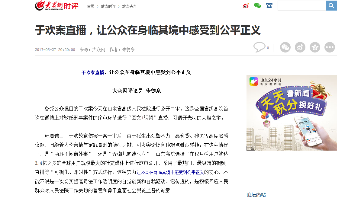 《于歡案直播,讓公眾在身臨其境中感受到公平正義》榮獲網(wǎng)絡(luò)評(píng)論類二等獎(jiǎng),這是大眾網(wǎng)連續(xù)第二年在中國(guó)新聞獎(jiǎng)的網(wǎng)絡(luò)評(píng)論類作品評(píng)選中獲獎(jiǎng)。該作品系山東省互聯(lián)網(wǎng)傳媒集團(tuán)副總編輯、大眾網(wǎng)總編輯朱德泉在于歡案二審期間創(chuàng)作,文章點(diǎn)贊依法治國(guó)和司法公開(kāi),以敢于發(fā)聲、快速發(fā)聲成為當(dāng)時(shí)輿論環(huán)境下的焦點(diǎn)和亮色。2017年5月27日,備受關(guān)注的于歡案迎來(lái)二審,山東省高級(jí)人民法院微博直播庭審過(guò)程。作者在收看直播過(guò)程中快速成稿,并于庭審結(jié)束后半小時(shí)在大眾網(wǎng)主站、官微、客戶端發(fā)布,牢牢把握了輿論主動(dòng)權(quán)。該作品是于歡案二審微博直播的全國(guó)主流媒體首篇評(píng)論,發(fā)布后被新浪、鳳凰等網(wǎng)站轉(zhuǎn)載80余次,在作者微博賬號(hào)@朱德泉上的閱讀量達(dá)1400余萬(wàn),得到政法系統(tǒng)從業(yè)人員和眾多網(wǎng)民點(diǎn)贊,起到了凝聚共識(shí)、安定人心的作用。