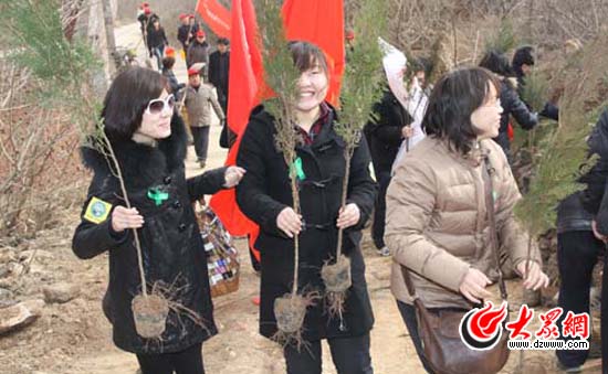 志愿者們?cè)谏较骂I(lǐng)取柏樹樹苗