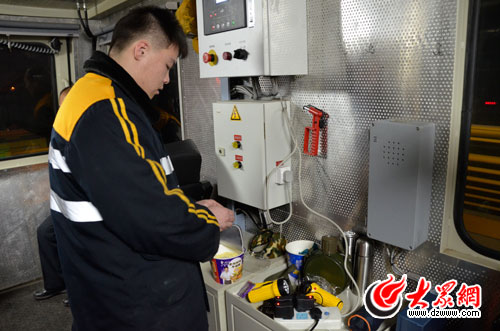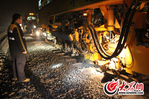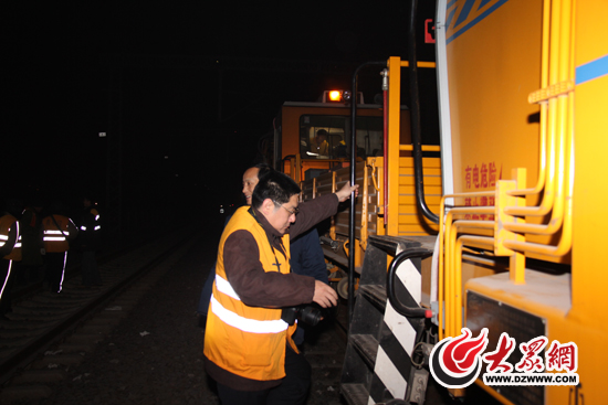 朱德泉 馬鑫 來源: 大眾網(wǎng)[提要] 1月13日晚上8點28分,淄博市臨淄火車站前,漆黑、安靜。大眾網(wǎng)記者跟隨濟南鐵路局工務機械段的20多名維修工走上月臺。此時,鐵軌上,一組50多米長的維修機車正靜臥在膠濟鐵路客運專線上,等待我們的到來。