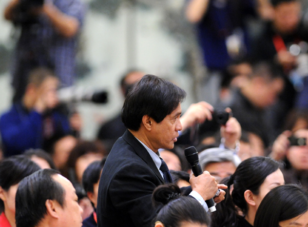 2012年3月14日10時(shí)50分,溫家寶總理在人民大會(huì)堂三樓金色大廳與中外記者見(jiàn)面并答問(wèn)。圖為美國(guó)全國(guó)廣播公司記者提問(wèn)。陳競(jìng)超 攝