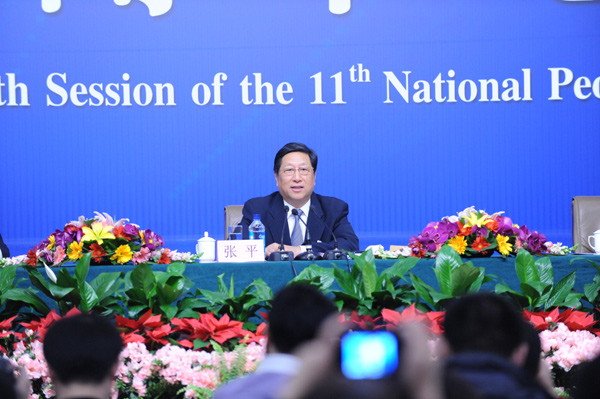 2012年3月5日,十一屆全國人大五次會議新聞中心在梅地亞中心多功能廳舉行記者會。國家發(fā)展和改革委員會主任張平就“經(jīng)濟(jì)形勢與宏觀調(diào)控”的相關(guān)問題回答中外記者的提問。圖為國家發(fā)展和改革委員會主任張平。王翰林 攝