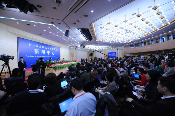 2012年3月5日,十一屆全國人大五次會議新聞中心在梅地亞中心多功能廳舉行記者會。國家發(fā)展和改革委員會主任張平就“經(jīng)濟(jì)形勢與宏觀調(diào)控”的相關(guān)問題回答中外記者的提問。圖為記者會現(xiàn)場。王翰林 攝