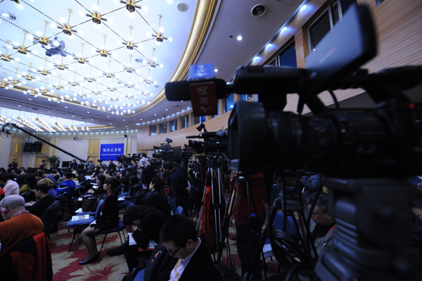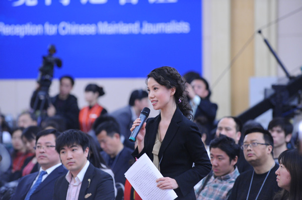 2012年3月5日,十一屆全國人大五次會議新聞中心在梅地亞中心多功能廳舉行記者會。國家發(fā)展和改革委員會主任張平就“經(jīng)濟(jì)形勢與宏觀調(diào)控”的相關(guān)問題回答中外記者的提問。圖為中央電視臺記者提問。王翰林 攝