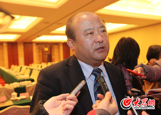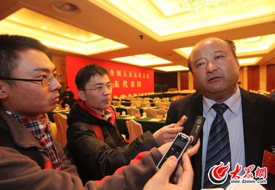 全國人大代表、臨沂市委書記張少軍接受大眾網(wǎng)記者(左一)采訪。