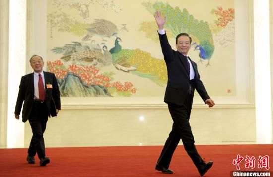 3月14日上午,十一屆全國人大五次會議閉幕。閉幕會后,中國國務院總理溫家寶與中外記者見面并回答記者提問。圖為溫家寶總理邁入人民大會堂金色大廳,向中外記者揮手。中新社記者 廖攀 攝