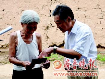 ◤沾化縣泊頭鎮(zhèn)83歲的鄭元英老人(左)領(lǐng)到了政府發(fā)放的養(yǎng)老金存折!(資料片)