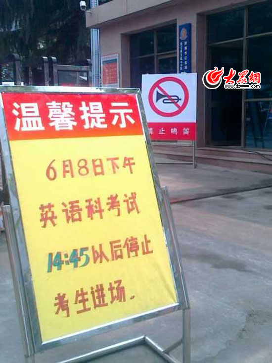 來源: 大眾網(wǎng)[提要] 距離考生進(jìn)場還有四十多分鐘,濟(jì)南七中考點(diǎn)上就將提醒牌擺放了出來,提醒廣大考生及時進(jìn)場。