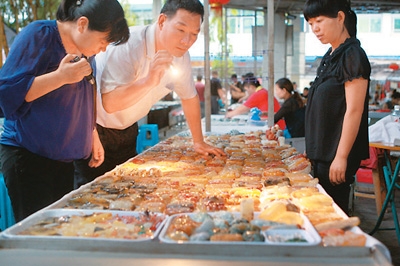 李先生夫婦在姐告“玉城”的貨攤前舉著強(qiáng)光手電仔細(xì)地驗(yàn)看玉石的成色。