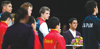 7月30日,英國體操隊選手惠特洛克(右四)在頒獎儀式上看向獲得銀牌的日本隊! ⌒氯A社記者 王麗莉攝