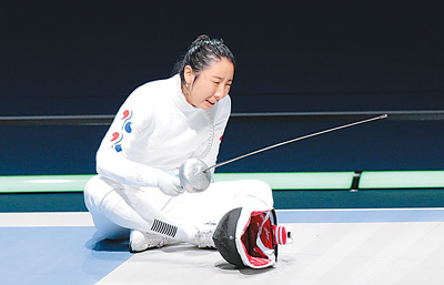 7月30日,韓國選手申雅蘭在女子個人重劍半決賽中對陣德國選手海德曼,由于決定勝負的一劍產(chǎn)生爭議,被判負。申雅蘭在賽場痛哭! ⌒氯A社記者 曾 毅攝