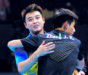 張繼科(右)賽后與隊(duì)友王皓擁抱慶祝。□新華社發(fā)