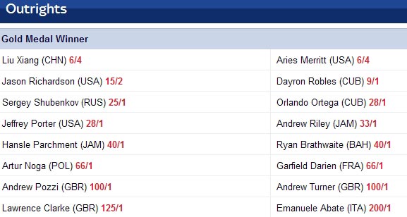 上周在鉆石聯(lián)賽倫敦站中,劉翔決賽退賽,但這并沒(méi)有影響到博彩公司對(duì)他的青睞,他以6/4的賠率高居榜首。當(dāng)然這次劉翔不是獨(dú)居榜首,美國(guó)人梅里特的奪冠賠率同樣為6/4。