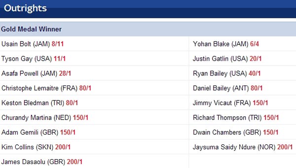在男子百米奪冠賠率方面,北京奧運(yùn)會(huì)冠軍、世界紀(jì)錄保持者牙買加人博爾特雖然近期表現(xiàn)不佳,但依然以8/11的賠率高居榜首。去年大邱世錦賽冠軍布雷克以6/4位居第二,他在牙買加國(guó)內(nèi)選拔賽中100米和200米雙殺博爾特,狀態(tài)驚人。美國(guó)雙雄蓋伊和加特林以及牙買加的鮑威爾分列奪冠賠率的3-5位。