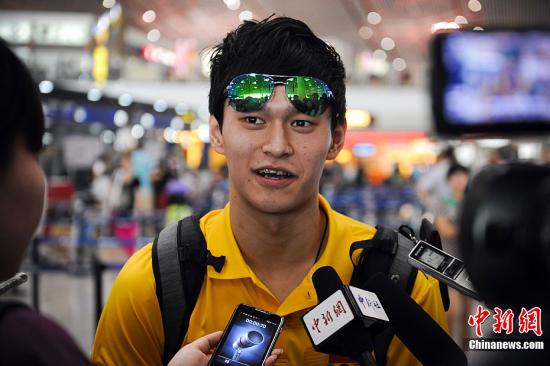 7月8日,中國(guó)游泳隊(duì)第二批隊(duì)員從北京首都國(guó)際機(jī)場(chǎng)出發(fā),踏上倫敦奧運(yùn)會(huì)征程。中國(guó)游泳隊(duì)頭號(hào)明星孫楊在接受記者采訪(fǎng)時(shí)表示,有信心至少帶回一枚金牌。中新社發(fā) 劉震 攝