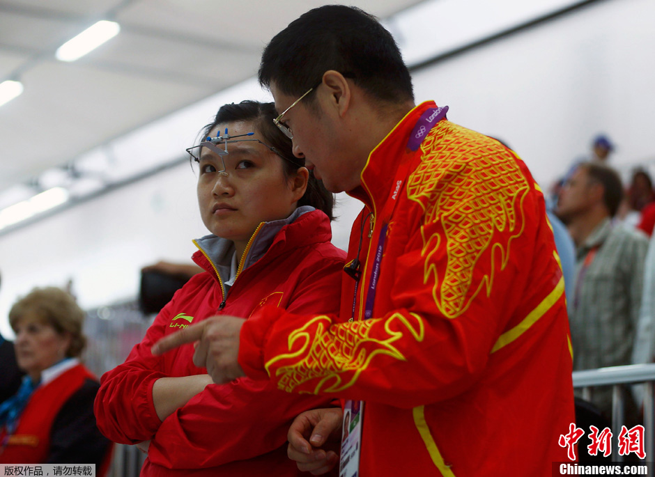 倫敦奧運會射擊比賽,女子10米氣手槍預賽,衛(wèi)冕冠軍郭文珺打出388環(huán)排在第一,蘇玉玲386環(huán)列第四,兩人攜手晉級決賽。圖為郭文珺在與教練交流。