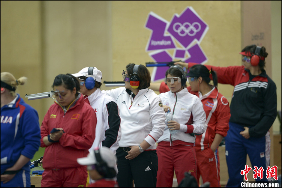 倫敦奧運會射擊比賽,女子10米氣手槍預賽,衛(wèi)冕冠軍郭文珺打出388環(huán)排在第一,蘇玉玲386環(huán)列第四,兩人攜手晉級決賽。圖為郭文珺在比賽中(左二)。