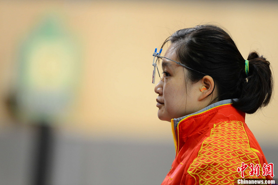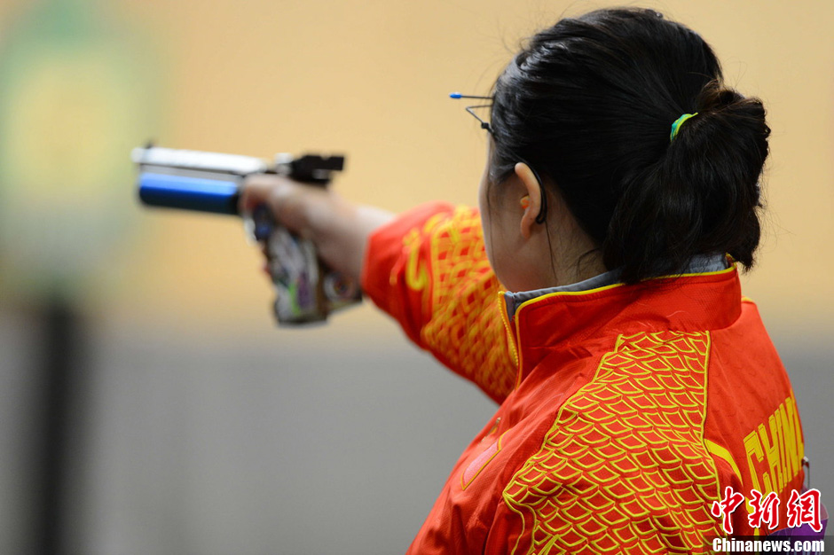 倫敦奧運會射擊比賽,女子10米氣手槍預賽,衛(wèi)冕冠軍郭文珺打出388環(huán)排在第一,蘇玉玲386環(huán)列第四,兩人攜手晉級決賽。圖為蘇玉玲在比賽中。
