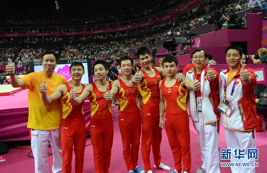 7月30日,中國(guó)體操隊(duì)在奪冠后慶祝。當(dāng)日,在倫敦奧運(yùn)會(huì)體操男團(tuán)決賽中,中國(guó)隊(duì)以275.997分的成績(jī)成功衛(wèi)冕。 新華社記者王建華攝