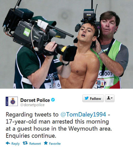 英國一名17歲網(wǎng)友日前因涉嫌在微博(Twitter)上侮辱英國跳水神童湯姆-戴利而被逮捕,目前多塞特郡警方正就此案展開調(diào)查。