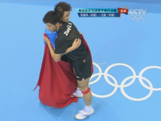 奪取了自己奧運生涯之中的第一枚金牌,恐怕這一刻的榮光讓張繼科永世難忘。奪冠后,張繼科沒有忘記自己的隊友,同樣也是今天決賽場上對手的王皓,只見張繼科與王皓緊緊的擁抱在了一起,然后兩人一起舉起了國旗,這一刻儼然是在向世界宣稱:這是中國的榮譽!接下來,在頒獎授牌儀式中,張繼科在登上冠軍的領(lǐng)獎臺之前又與王皓緊緊的相擁,這是男人之間的擁抱,千言萬語,都不及這肩膀的對撞。