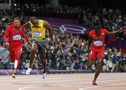 發(fā)令槍響起,決賽的起跑十分順利,沒(méi)有出現(xiàn)搶跑的情況。博爾特的起跑反應(yīng)為0.165秒,布雷克為0.179秒,起跑最快的是第一道的馬丁納,只用了0.139秒。前30米,加特林和布雷克稍稍領(lǐng)先,博爾特前幾步還是略顯沉重,暫時(shí)落后。