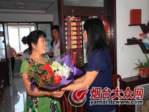 大眾網(wǎng)記者代表網(wǎng)友向周璐璐母親獻(xiàn)上鮮花表示祝賀
