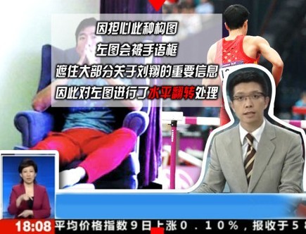 在8月10日的《共同關注》節(jié)目中,演播室背景里是劉翔治療的圖片,但鏡頭里,劉翔的“左腳”卻纏著厚厚的繃帶,與此前報道的劉翔右腳進行手術的事實不符。新聞播出后,有網(wǎng)友立刻找出劉翔受傷時的圖片進行對比,發(fā)現(xiàn)央視的鏡頭中劉翔的T恤胸前文字和發(fā)型都左右顛倒。實際上,央視之所以擺出這個烏龍是由于使用了PS鏡像處理,造成了圖片的左右調換。