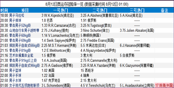 12日奧運(yùn)賠率:中國(guó)沖擊最后一金 夢(mèng)十輕松奪冠