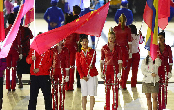 在入場口204個國家和地區(qū)由旗手代表列隊入場,在順序上與開幕式相同,希臘代表走在最前面,英國代表最后出場。中國代表團(tuán)的旗手是徐莉佳,她在帆船激光雷迪爾級比賽中為中國隊勇奪金牌。各個國家的旗幟走向米字形的中心場地,而此時中心場地顯得更加燦爛。隨著旗手的就位,各國運動員從觀眾席的四面八方走向了中心場地,這可以說是倫敦的一大創(chuàng)意,沒有傳統(tǒng)的走入,而是更加親民的與觀眾為伴,從觀眾席走下來的運動員不斷的與觀眾打招呼握手,進(jìn)而走到屬于自己國家的位置上。