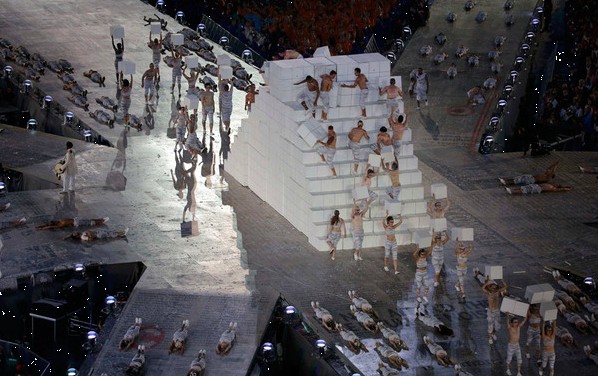 現(xiàn)場的演員用非常簡單卻具有圖騰崇拜意味的舞蹈表達(dá)對奧林匹克的敬意。大屏幕上再度回放本屆奧運(yùn)會(huì)中比賽的影像。