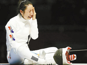 韓國選手申雅嵐在女子個人重劍半決賽中與德國名將海德曼在常規(guī)時間打成5比5平,在距計(jì)時賽結(jié)束前1秒左右,海德曼射出最后一劍,并以6比5制勝。韓國隊(duì)對于決勝一劍進(jìn)行了上訴。1小時之后,上訴被駁回。在申訴失敗后,申雅嵐坐地不起,導(dǎo)致隨后的銅牌戰(zhàn)和決賽全部推遲。