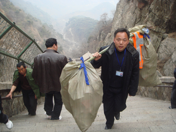愛崗敬業(yè)、無私奉獻(xiàn)。王常文推出了《南天門管理區(qū)保潔制度》、《南天門清潔隊(duì)交接班制度》、《衛(wèi)生科工作考核辦法》等,做好分工,責(zé)任到人,定崗定位定標(biāo)準(zhǔn),確保工作的標(biāo)準(zhǔn)化、制度化、規(guī)范化,形成“腿勤、眼勤、嘴勤、手勤”的工作方法。每年累計(jì)栓大繩下溝100余次,清理垃圾600余袋,平時(shí)對垃圾箱進(jìn)行粉刷維修,使泰山每天都是新的。岱頂海拔1500多米,工作生活條件艱苦,冬天寒風(fēng)刺骨,夏天潮氣逼人。但不論盛夏酷暑,還是嚴(yán)冬臘月,凡工作日,他每天都要走遍岱頂每一個(gè)角落,檢查衛(wèi)生管理情況,確保不留死角;對登山盤道上的紙屑、煙頭,隨見隨清;發(fā)現(xiàn)路邊山崖樹梢上掛的白色塑垃圾,他便和隊(duì)員一起,腰扎安全帶,下到懸崖山,用竹竿一一挑下來,通過他的身體力行,隊(duì)員們自覺地以他為榜樣,清潔隊(duì)形成了的好風(fēng)氣。