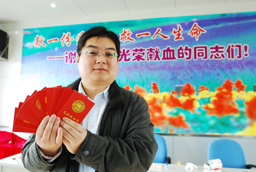 由于堅持連續(xù)十一年無償獻(xiàn)血,2010年獲得了衛(wèi)生部和解放軍后勤部聯(lián)合頒發(fā)的無償獻(xiàn)血金獎,一打無償獻(xiàn)血證和無償獻(xiàn)血的金銀銅獎牌、獎狀讓同事們刮目相看,這不僅是自己的榮譽,也是自己為社會貢獻(xiàn)的見證,自己所獻(xiàn)出的每一滴血都有可能幫助一位危在旦夕的病人。(實習(xí)記者:萬蘇輝)