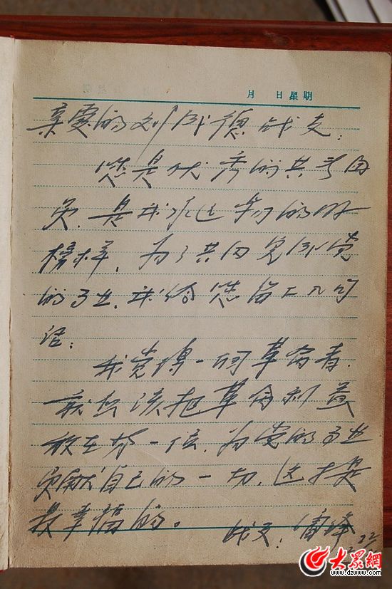 1962年2月,劉成德作為師部推薦的英模代表,參加了沈陽(yáng)軍區(qū)首屆共青團(tuán)員代表大會(huì)。會(huì)上,雷鋒與劉成德等代表在主席臺(tái)就座。雷鋒得知?jiǎng)⒊傻碌氖论E后,非常感動(dòng)。當(dāng)即給劉成德寫下:“您是優(yōu)秀的共青團(tuán)員,是我永遠(yuǎn)學(xué)習(xí)的好榜樣。為了共同完成黨的事業(yè),我給您留下幾句話:我覺得一個(gè)革命者,就應(yīng)該把革命利益放在第一位,為黨的事業(yè)貢獻(xiàn)自己的一切,這才是最幸福的。”
