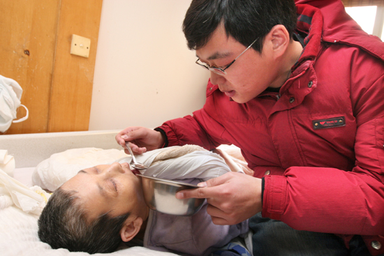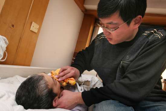 家中親戚多有不便,只有姥姥和舅舅能前來幫著照顧一下母親,孫成法這才意識到前方路途坎坷,他暗地里給自己鼓勁:“不管怎樣也不能放棄希望,一旦放棄了希望就不會有奇跡發(fā)生!被厥走@兩年多的艱辛時光,孫成法平靜的臉上沒有悲傷,他說:“媽媽生我養(yǎng)我不易,我沒有工作,也沒有能力回報她,我能做的只是好好伺候她!