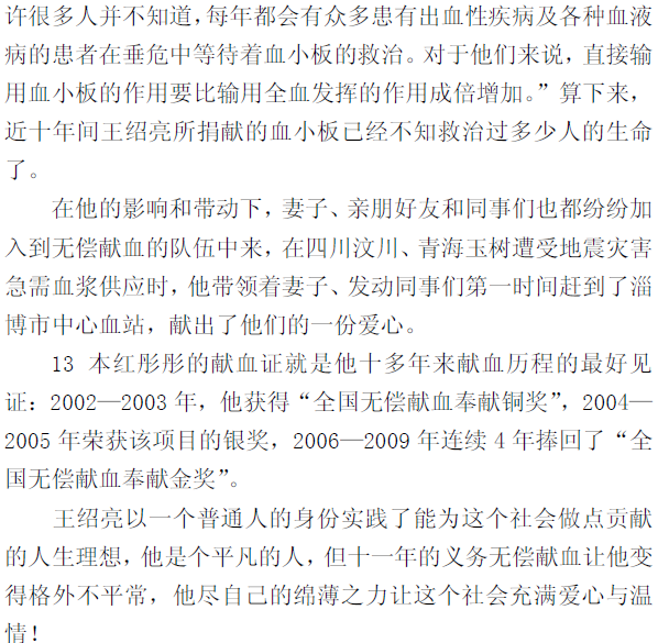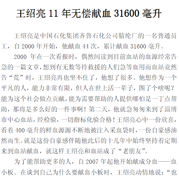 來(lái)源: 大眾網(wǎng)[提要] 王紹亮是中國(guó)齊魯石化公司腈綸廠的一名普通員工,自2000年開(kāi)始,他獻(xiàn)血44次累計(jì)獻(xiàn)血31600毫升