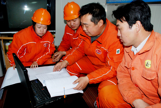 葛磊與技術(shù)人員一道研究鉆井施工方案