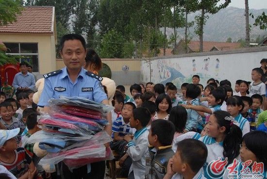 (二)開展幫扶活動,播撒人間大愛!拔易约壕褪菑霓r(nóng)村走出來的,我對基層學(xué)校的貧困學(xué)生總有著一份特殊的感情!倍嗄暌詠恚栐獞c同志主動與地處偏遠山區(qū)的南湖鎮(zhèn)下湖小學(xué)4名困難學(xué)生結(jié)成一對一長期幫扶對子,資助學(xué)費累計已達8400元;并為市特殊教育學(xué)校的特殊兒童們送去價值2800余元的體育用品,讓長期生活在閉塞環(huán)境里的孩子們切實感受到來自警營的溫暖和關(guān)愛。6月1日國際兒童節(jié),他和牽手志愿者帶著拳拳愛心以及為孩子們募集到的自行車、書包、課外書等學(xué)習(xí)用具,來到五蓮縣戶部鄉(xiāng)王家大村小學(xué)和日照街道三小,幫助孩子們圓了心底一份小小的夢想,給他們送去了節(jié)日的祝福和關(guān)愛!伴L大后,我也要象您一樣,去幫助那些需要幫助多人。”六年級的王愷緊緊抱著一個嶄新的書包——剛剛實現(xiàn)的夢想,道出了所有孩子們的心聲。