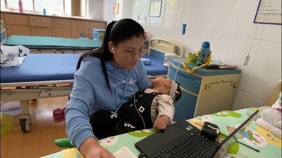 商萃萃說,孩子剛住院的前幾天,情況比較嚴重,每天從早上九點一直到下午四點都需要輸液治療,基本占據(jù)了整個白天的時間,因為孩子年齡太小,平時只能抱在懷里安撫情緒。由于網(wǎng)課時間和孩子輸液時間交叉,為了克服困難,商萃萃便一邊抱著正在輸液的孩子,一邊給學生們上課。每天晚上,商萃萃還要起來數(shù)次給孩子測量體溫,觀察孩子的情況。同時,為了不耽誤學生們第二天的課程,商萃萃只能趁孩子熟睡時抓住有限的時間備課、給學生批改作業(yè)。