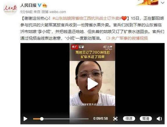 7月15日,在江西鄱陽湖抗洪的火箭軍某旅官兵收到了一份跨省水果外賣,官兵們通過訂單找到了這位網(wǎng)名“李小妮”的熱心人,他們連線致謝的視頻也在網(wǎng)絡(luò)上火了起來,網(wǎng)友親切點(diǎn)贊:“又被暖哭了” “臨沂姑娘太棒了”。