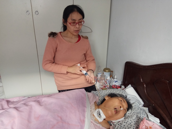 “喉嚨這里的管子每隔兩三個小時就要消毒一次,否則會導(dǎo)致發(fā)炎。成人尿不濕戴得久了不透氣,用尿布雖然要洗,但是只要及時更換她會更舒服。每隔一小時喂一次水,吃飯一天要喂五次,一次喂太多她會不舒服!奔词棺约荷眢w也不是很好,但這一連串細(xì)致、繁瑣的工作,已經(jīng)成為周穎十幾年來固定的生活模式。